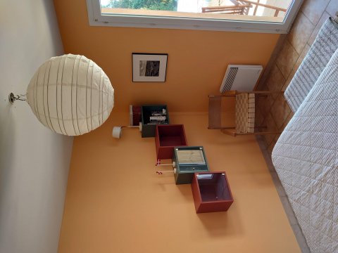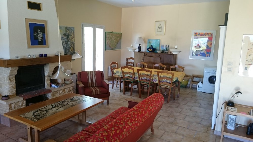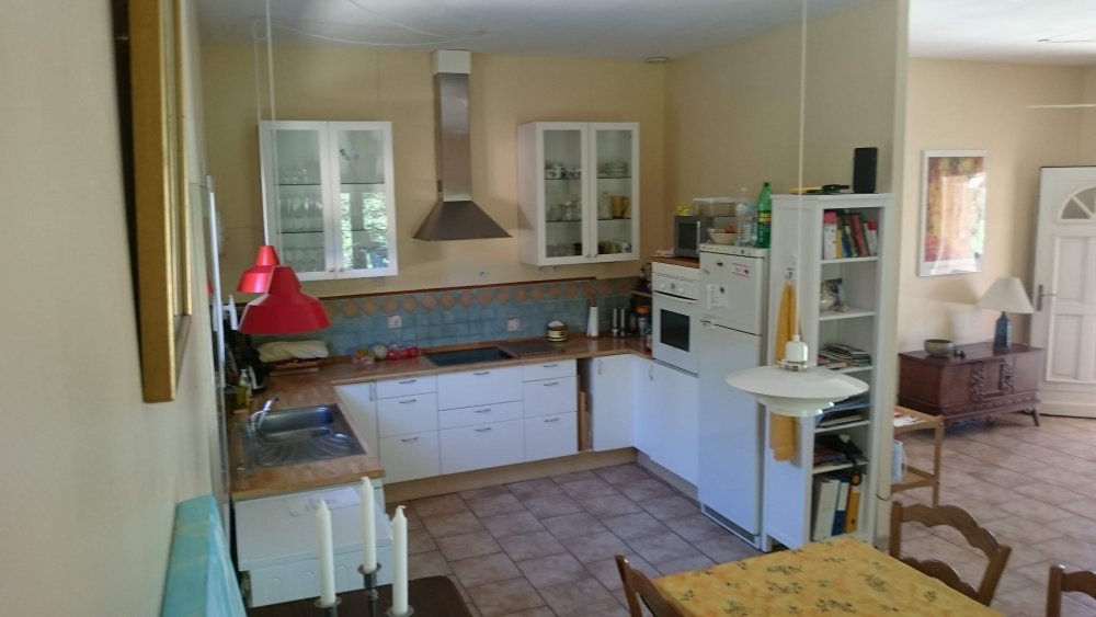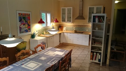 Huset indeholder stort køkken-stue i et plan med udgang til terrasse. Køkkenet er udstyret med opvaskemaskine og vaskemaskine.